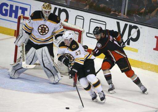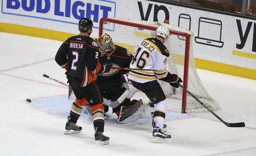 NOTES: Anaheim has won five consecutive games against Boston, including three straight at home. ... Boston dropped to 6-3-1 in the first of back-to-back games this season. ... Zdeno Chara got into a fight on his 39th birthday. The Boston captain tussled with Clayton Stoner for his first fighting major since the 2013-14 season.