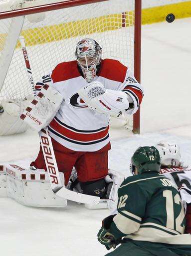 Carolina Hurricanes goalie Cam Ward stops a shot in the first period of an NHL hockey game against the Minnesota Wild Saturday, March 19, 2016, in St. Paul, Minn. (AP Photo/Jim Mone) The Associated Press
