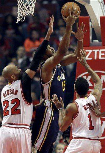 Utah Jazz forward Derrick Favors, center, goes up for a shot against Chicago Bulls forward Taj Gibson, left, and guard Derrick Rose during the first half of an NBA basketball game Saturday, March 19, 2016, in Chicago. (AP Photo/Nam Y. Huh) The Associated Press