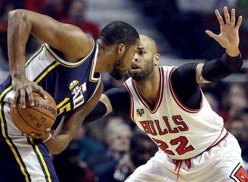 Chicago Bulls forward Taj Gibson, right, guards Utah Jazz forward Derrick Favors during the first half of an NBA basketball game Saturday, March 19, 2016, in Chicago. (AP Photo/Nam Y. Huh) The Associated Press