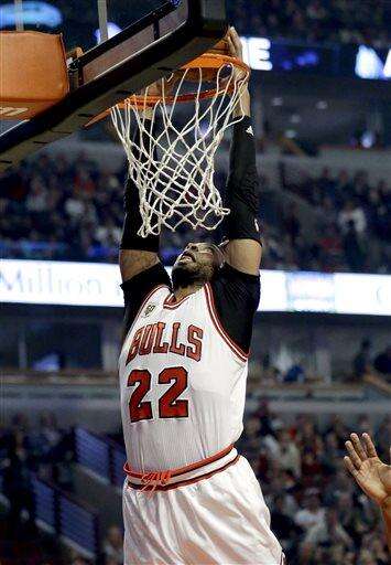 Chicago Bulls forward Taj Gibson dunks against the Utah Jazz during the first half of an NBA basketball game Saturday, March 19, 2016, in Chicago. (AP Photo/Nam Y. Huh) The Associated Press