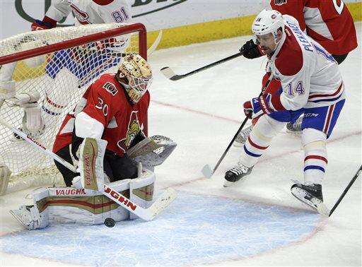 Montreal Canadiens' Tomas Plekanec (14) stops outside the crease as the puck passes Ottawa Senators goalie Andrew Hammond (30) during the second period of an NHL hockey game Saturday, March 19, 2016, in Ottawa, Ontario. (Justin Tang/The Canadian Press via AP) The Associated Press