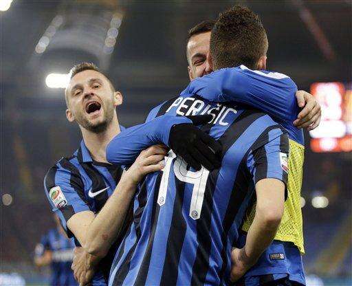 Inter Milan’s Ivan Perisic, right with back to camera, celebrates with his teammates after scoring during a Serie A soccer match between Roma and Inter Milan, at Rome's Olympic Stadium, Saturday, March 19, 2016. (AP Photo/Andrew Medichini) The Associated Press