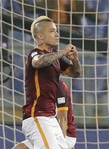 Roma's Radja Nainggolan celebrates after scoring during a Serie A soccer match between Roma and Inter Milan, at Rome's Olympic Stadium, Saturday, March 19, 2016. (AP Photo/Andrew Medichini) The Associated Press