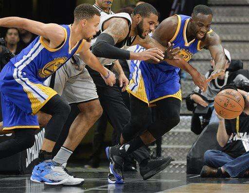 San Antonio Spurs forward LaMarcus Aldridge, center, chases the ball against Golden State Warriors' Stephen Curry (30) and Draymond Green during the first half of an NBA basketball game, Saturday, March 19, 2016, in San Antonio. (AP Photo/Darren Abate) The Associated Press