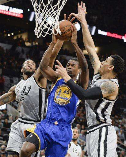 Golden State Warriors forward Harrison Barnes (40) attempts to shoot between San Antonio Spurs' Kawhi Leonard (2), and Danny Green during the first half of an NBA basketball game, Saturday, March 19, 2016, in San Antonio. (AP Photo/Darren Abate) The Associated Press