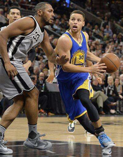 Golden State Warriors guard Stephen Curry (30) drives around San Antonio Spurs forward Boris Diaw, of France, during the first half of an NBA basketball game, Saturday, March 19, 2016, in San Antonio. (AP Photo/Darren Abate) The Associated Press