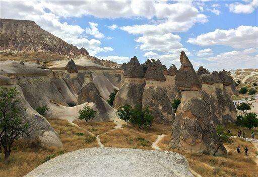 This Aug. 26, 2015 photo, tourists wanter by mushroom-shaped fairy chimneys at Pasabag, in the historical Cappadocia region of Goreme, Turkey. (AP Photo/Courtney Bonnell) The Associated Press