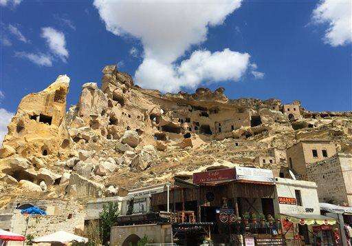 In this Aug. 26, 2015, photo, a cafe and market appear at the foot of abandoned cave homes in the Cavusin village in the Cappadocia region of Turkey. It is no longer inhabited for safety reasons. (AP Photo/Courtney Bonnell) The Associated Press