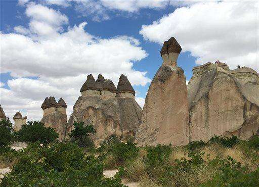 This Aug. 26, 2015 photo, mushroom-shaped fairy chimneys line the landscape at Pasabag, in the historical Cappadocia region of Goreme, Turkey. (AP Photo/Courtney Bonnell) The Associated Press