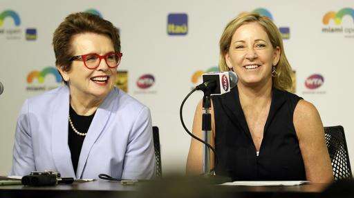 Billie Jean King, left, and Chris Evert, right, smile as they talk to reporters at the Miami Open tennis tournament in Key Biscayne, Fla., Wednesday, March 23, 2016. King and Evert talked about the resignation of the tournament director of the BNP Paribas Open, who said women's pro tennis players "ride on the coattails of the men." (AP Photo/Alan Diaz) The Associated Press