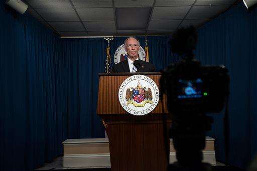 Alabama Gov. Robert Bentley speaks during a news conference Wednesday, March 23, 2016, at the state Capitol in Montgomery, Ala. Bentley admitted Wednesday he made inappropriate remarks to a top female staffer two years ago, but he denied accusations that he had a physical affair. Bentley said during the news conference that he apologized to his family and to the family of the female staff member for the remarks he called "a mistake." (Albert Cesare/The Montgomery Advertiser via AP) NO SALES; MANDATORY CREDIT The Associated Press