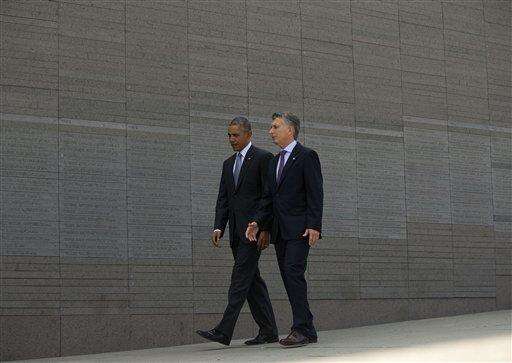 President Barack Obama and Argentine President Mauricio Macri visit Parque de la Memoria in Buenos Aires, Argentina, Thursday, March 24, 2016. Obama visited the memorial to victims of the country's murderous US-backed dictatorship who were killed or went missing from 1976-1983. (AP Photo/Pablo Martinez Monsivais) The Associated Press