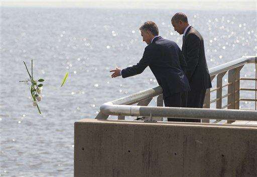 President Barack Obama watches as Argentine President Mauricio Macri tosses roses into the river during their visit to Parque de la Memoria (Remembrance Park) in Buenos Aires, Argentina, Thursday, March 24, 2016. Obama visited the memorial to victims of the country's murderous US-backed dictatorship who were killed or went missing from 1976-1983. (AP Photo/Pablo Martinez Monsivais) The Associated Press