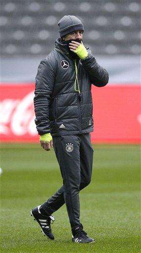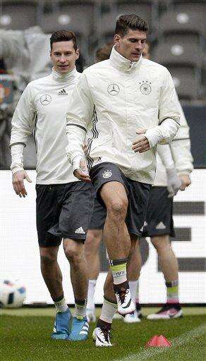 The players Mario Gomes, front, and Julian Draxler, rear, attend a training session of the German national soccer team in Berlin, Germany, Friday, March 25, 2016. Germany will face the team of England on Saturday, March 26, 2016 for a friendly soccer match in the German capital Berlin. (AP Photo/Michael Sohn) The Associated Press