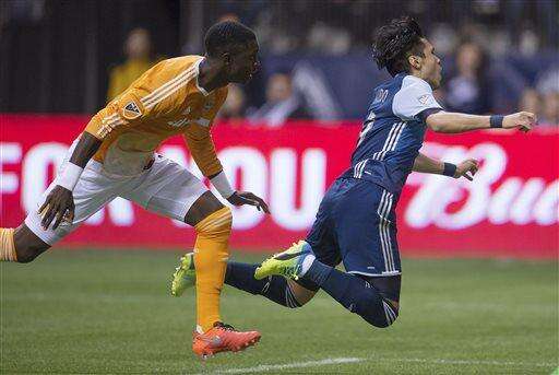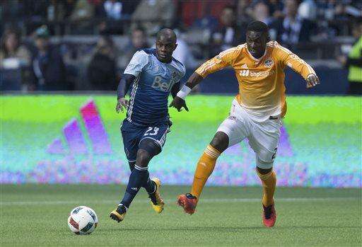 Vancouver Whitecaps' Kekuta Manneh, left, moves the ball past Houston Dynamo's Jalil Anibaba during the first half of an MLS soccer game in Vancouver, British Columbia, on Saturday, March 26, 2016. (Darryl Dyck/The Canadian Press via AP)