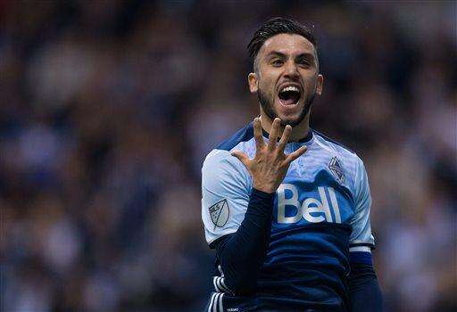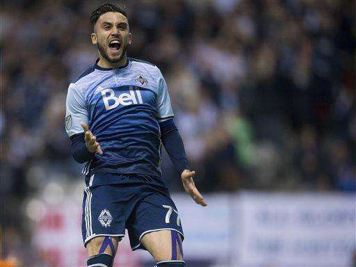 Vancouver Whitecaps' Pedro Morales celebrates his penalty-kick goal against the Houston Dynamo during the first half of an MLS soccer game in Vancouver, British Columbia, on Saturday, March 26, 2016. (Darryl Dyck/The Canadian Press via AP)