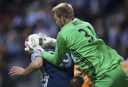 Houston Dynamo goalkeeper Joe Willis, right, grabs the ball away from Vancouver Whitecaps' Octavio Rivero during the first half of an MLS soccer game in Vancouver, British Columbia, on Saturday, March 26, 2016. (Darryl Dyck/The Canadian Press via AP)