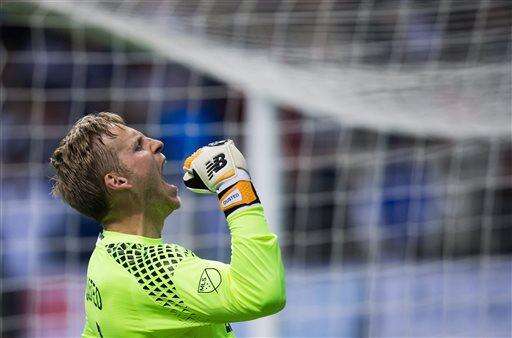 Vancouver Whitecaps goalkeeper David Ousted celebrates the team's 1-0 win against the Houston Dynamo during an MLS soccer game in Vancouver, British Columbia, on Saturday, March 26, 2016. (Darryl Dyck/The Canadian Press via AP)