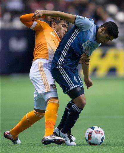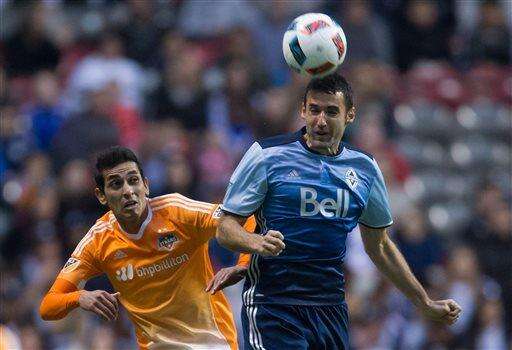 Vancouver Whitecaps' Andrew Jacobson, right, gets his head on the ball in front of Houston Dynamo's Cristian Maidana during the first half of an MLS soccer game in Vancouver, British Columbia, on Saturday, March 26, 2016. (Darryl Dyck/The Canadian Press via AP)