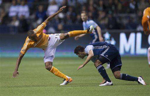 Houston Dynamo's Ricardo Clark, left, falls over Vancouver Whitecaps' Matias Laba during the first half of an MLS soccer game in Vancouver, British Columbia, on Saturday, March 26, 2016. (Darryl Dyck/The Canadian Press via AP)