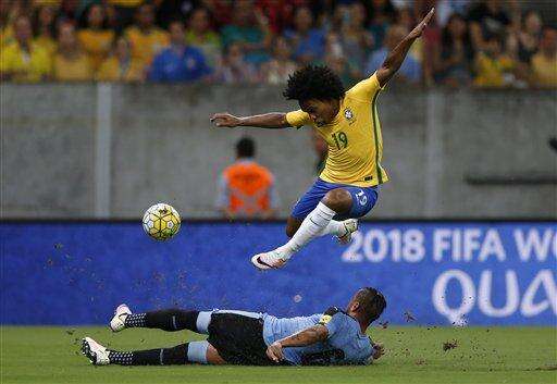 Brazil's Willian jumps as he fights for the ball with Uruguay's Alvaro Pereira during a 2018 World Cup qualifying soccer match at the Pernambuco Arena, in Recife, Brazil, Friday, March 25, 2016. (AP Photo/Leo Correa) The Associated Press