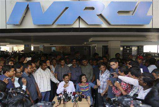 K Panduranga Rao, left, group head of human resources and administration, and Sita, legal head of IVRCL, the company that was constructing the underpass in Kolkata, that collapsed partially on Thursday, March 31, address the media at their office in Hyderabad, India, Friday, April 1, 2016. Police detained five officials from IVRCL, contracted in 2007 to build the overpass, and sealed its Kolkata office. (AP Photo/Mahesh Kumar)