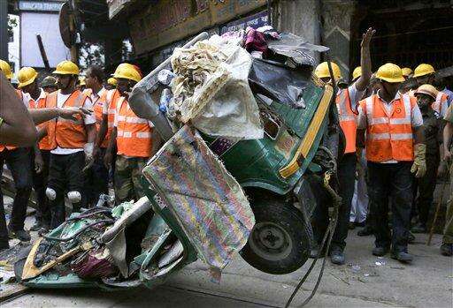 A damaged three-wheeled vehicle is taken out from the rubble of a collapsed overpass in Kolkata, India, Friday, April 1, 2016. The overpass spanned nearly the width of the street and was designed to ease traffic through the densely crowded Bara Bazaar neighborhood in the capital of the east Indian state of West Bengal. About 100 meters (300 feet) of the overpass fell, while other sections remained standing. (AP Photo/Bikas Das)