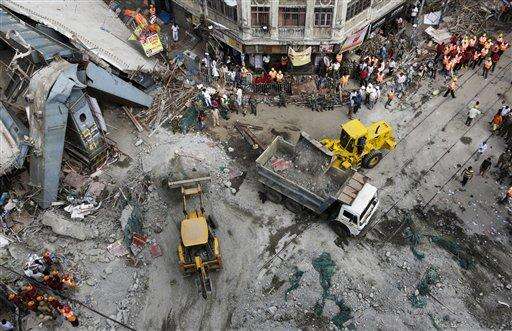 Excavator machines remove debris of a partially collapsed overpass in Kolkata, India, Friday, April 1, 2016. The overpass spanned nearly the width of the street and was designed to ease traffic through the densely crowded Bara Bazaar neighborhood in the capital of the east Indian state of West Bengal. About 100 meters (300 feet) of the overpass fell, while other sections remained standing. (AP Photo/Bikas Das)