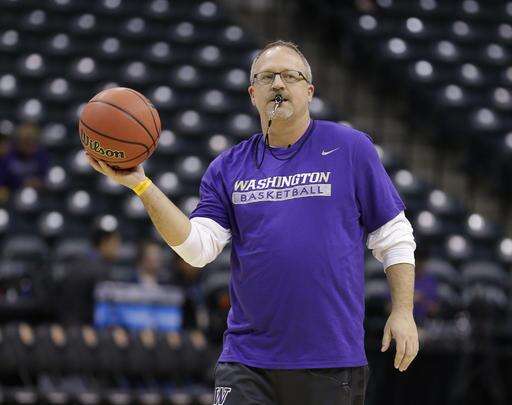 Washington head coach Mike Neighbors makes a pass during college basketball practice for the women's Final Four in the NCAA Tournament Saturday, April 2, 2016, in Indianapolis. (AP Photo/Michael Conroy) The Associated Press