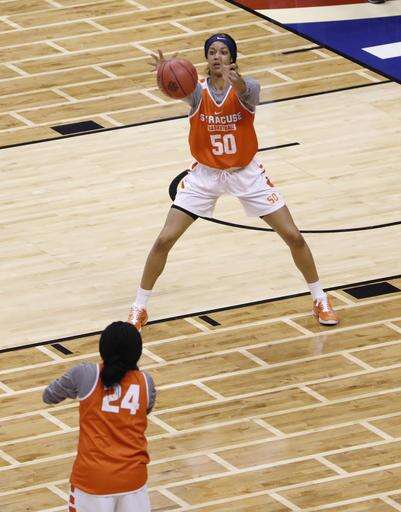 Syracuse's Briana Day (50) catches a pass from Brandi Fowler (24) during college basketball practice for the women's Final Four in the NCAA Tournament Saturday, April 2, 2016, in Indianapolis. (AP Photo/AJ Mast) The Associated Press