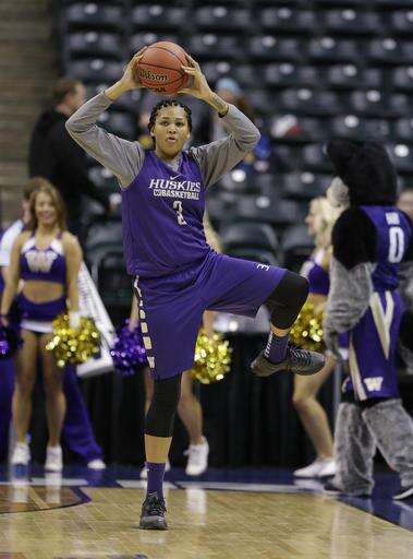 Washington's Talia Walton (3) stretches during college basketball practice for the women's Final Four in the NCAA Tournament Saturday, April 2, 2016, in Indianapolis. (AP Photo/Michael Conroy) The Associated Press