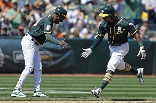 Oakland Athletics' Khris Davis, right, celebrates with third base coach Ron Washington after hitting a home run off San Francisco Giants' Matt Cain in the third inning of an exhibition baseball game Saturday, April 2, 2016, in Oakland, Calif. (AP Photo/Ben Margot) The Associated Press