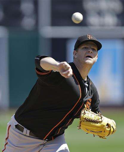 San Francisco Giants' Matt Cain works against the Oakland Athletics in the first inning of an exhibition baseball game Saturday, April 2, 2016, in Oakland, Calif. (AP Photo/Ben Margot) The Associated Press