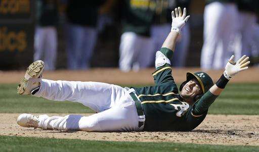 Oakland Athletics' Jed Lowrie celebrates as he slides to score an inside the park two-run home run against the San Francisco Giants in the third inning of an exhibition baseball game Saturday, April 2, 2016, in Oakland, Calif. (AP Photo/Ben Margot) The Associated Press
