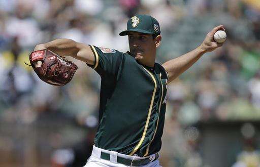 Oakland Athletics pitcher Eric Surkamp works against the San Francisco Giants in the second inning of an exhibition baseball game Saturday, April 2, 2016, in Oakland, Calif. (AP Photo/Ben Margot) The Associated Press