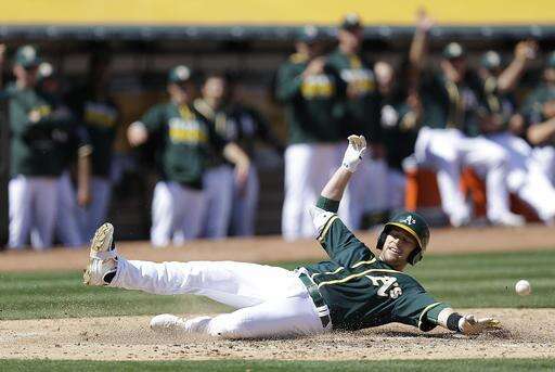 Oakland Athletics' Jed Lowrie slides to score an inside the park two run home run against the San Francisco Giants in the third inning of an exhibition baseball game Saturday, April 2, 2016, in Oakland, Calif. (AP Photo/Ben Margot) The Associated Press