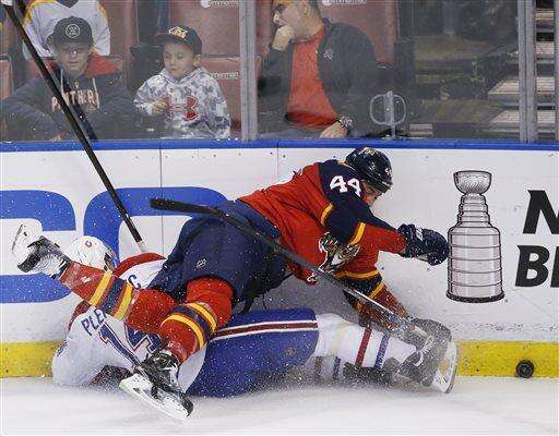 Florida Panthers defenseman Erik Gudbranson (44) and Montreal Canadiens center Tomas Plekanec (14) go down as they battle for the puck during the first period of an NHL hockey game, Saturday, April 2, 2016, in Sunrise, Fla. (AP Photo/Wilfredo Lee) The Associated Press