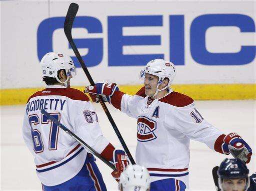 Montreal Canadiens right wing Brendan Gallagher (11) celebrates with left wing Max Pacioretty (67) after Gallagher scored during the first period of an NHL hockey game against the Florida Panthers, Saturday, April 2, 2016, in Sunrise, Fla. (AP Photo/Wilfredo Lee) The Associated Press