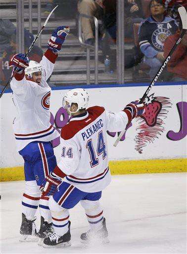 Montreal Canadiens center Torrey Mitchell (17) celebrates his goal with center Tomas Plekanec (14) during the second period of an NHL hockey game against the Florida Panthers, Saturday, April 2, 2016, in Sunrise, Fla. (AP Photo/Wilfredo Lee) The Associated Press