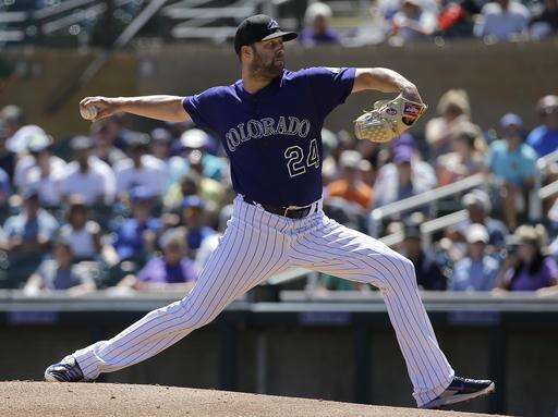 Colorado Rockies starting pitcher Jordan Lyles (24) throws against the Seattle Mariners during the first inning of a spring training baseball game in Scottsdale, Ariz., Saturday, April 2, 2016. (AP Photo/Jeff Chiu) The Associated Press