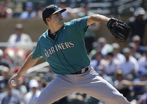 Seattle Mariners starting pitcher Nathan Karns throws during the first inning of a spring training baseball game against the Colorado Rockies in Scottsdale, Ariz., Saturday, April 2, 2016. (AP Photo/Jeff Chiu) The Associated Press