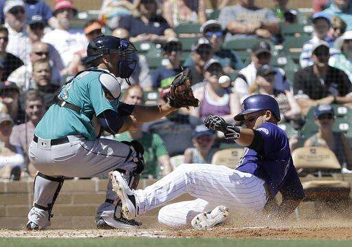 Colorado Rockies' Gerardo Parra, right, scores against Seattle Mariners catcher Chris Iannetta during the second inning of a spring training baseball game in Scottsdale, Ariz., Saturday, April 2, 2016. (AP Photo/Jeff Chiu) The Associated Press