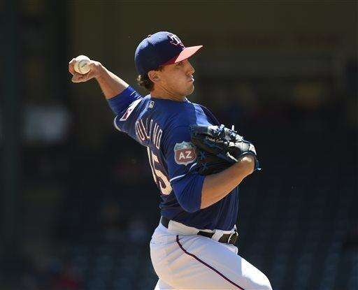 Texas Rangers starting pitcher Derek Holland throws against the Cleveland Indians during the first inning of their exhibition baseball game in Arlington, Texas, on Saturday, April 2, 2016. (AP Photo/Michael Ainsworth) The Associated Press