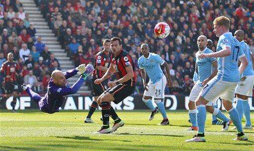 BOURNEMOUTH, England (AP) - Manchester City kept its dwindling title chances alive by beating Bournemouth 4-0 in the English Premier League, with midfielder Kevin De Bruyne making a fabulous return on Saturday.