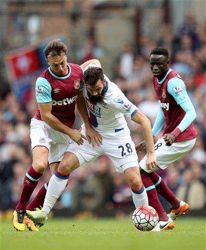 LONDON (AP) - Dimitri Payet's latest stunning free kick wasn't enough to earn 10-man West Ham a victory in its pursuit of Champions League football next season as Crystal Palace scored late to earn a 2-2 draw in the English Premier League on Saturday.