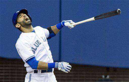 Toronto Blue Jays' Jose Bautista reacts after flying out to right field during the third inning of an exhibition baseball game against the Boston Red Sox, Saturday, April 2, 2016 in Montreal. (Paul Chiasson/The Canadian Press via AP) MANDATORY CREDIT The Associated Press