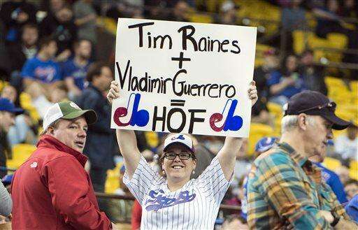 A fan shows her appreciation for two former Montreal Expos before the start of an exhibition baseball game between the Toronto Blue Jays and the Boston Red Sox, Saturday, April 2, 2016, in Montreal. (Paul Chiasson/The Canadian Press via AP) MANDATORY CREDIT The Associated Press