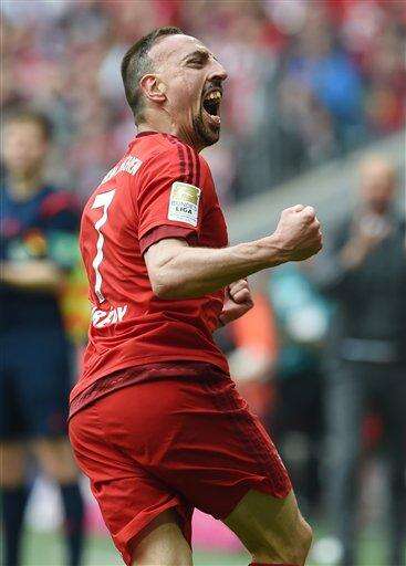 Munich's Franck Ribery celebrates his opening goal during the German Bundesliga soccer match between Bayern Munich and Eintracht Frankfurt, in Munich Saturday April 2, 2016. (Tobias Hase/dpa via AP) v The Associated Press