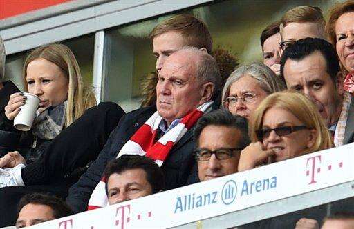 Former president of Bayern Munich, Uli Hoeness attends the German Bundesliga soccer match between Bayern Munich and Eintracht Frankfurt in Munich, Germany, Saturday April 2, 2016. (Tobias Hase/dpa via AP) The Associated Press